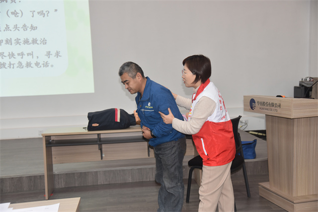 培训课上,王燕老师首先介绍了红十字运动的基本知识,随后重点针对日常生活中较为常见的意外事故,向在场员工详细讲解,并演示了创伤救护、气道异物梗阻急救、海姆立克急救法、心肺复苏及包扎固定等急救技能和相关知识。