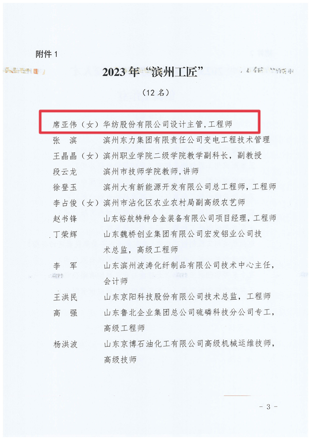近日,滨州市总工会下发了《关于公布 2023 年滨州工匠滨州市劳模和工匠人才创新工作室的通知》,公司家纺研发部设计主管、工程师席亚伟荣获2023年“滨州工匠”称号、王鲁刚工匠人才创新工作室荣获“滨州市劳模和工匠人才创新工作室”荣誉。