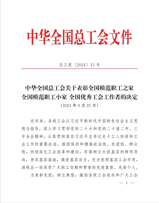 近日,中华全国总工会印发《中华全国总工会关于表彰全国模范职工之家、全国模范职工小家、全国优秀工会工作者的决定》,公司工会委员会荣获“全国模范职工之家”荣誉称号。
