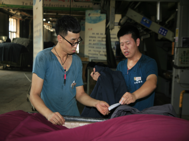 花一车间后处理技术员张延军(图右)与轧光机机长吴秀祝在交流生产情况。他俩表示,每一米优质产品都是靠专注认真干出来的。