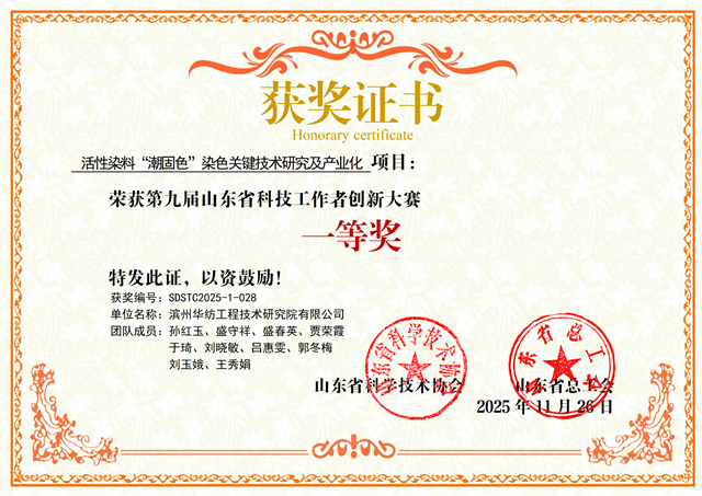 近日,在第九届山东省科技工作者创新大赛决赛中,公司工程技术研究院团队研发的“活性染料‘潮固色’染色关键技术研究及产业化”项目,经多轮严格评审,从282个入围决赛的优秀项目中脱颖而出,荣获大赛一等奖。