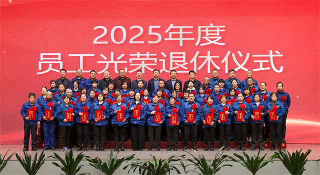 会议为2025年度退休员工举行光荣退休仪式。公司党委委员、纪委副书记、副总经理孙玉涛宣读退休员工名单,党委书记、董事长盛守祥为退休员工代表颁发荣誉证书。退休员工代表王立松作为退休职工代表发言,深情诉说数十载与公司同行的点滴,诚挚送上对公司的衷心祝福。